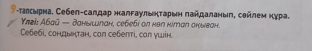 9-1 -тапсырма. Себеп-салдар жалғаулықтарын пайдаланып, сөйлем құра. Үлгі: Абай - данышпан, себебі ол кеп кітап оқыған. - Себебі, сондықтан, сол себепті, сол ушiн. Дам 30 баллов