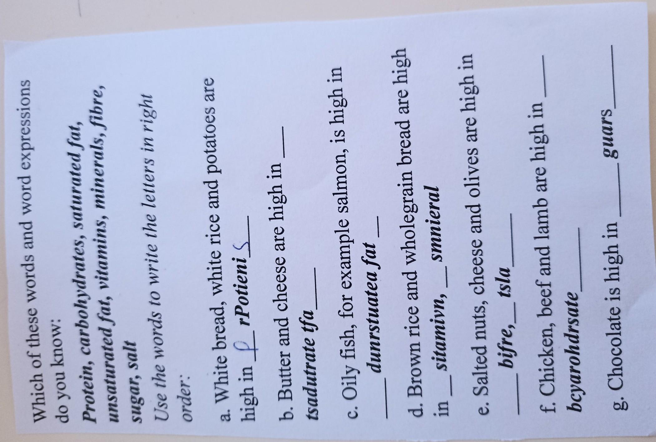 a) protein; b) saturated fat; c) unsaturated fat; d) vitamins, minerals; e) fibre, salt; f) carbohydrates; g) sugar