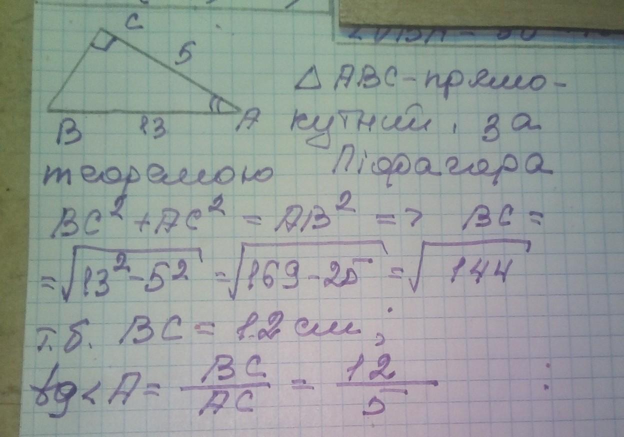 У трикутнику АBC <С=90° AB=13см, АС= 5 см. Знайдіть tgzA.