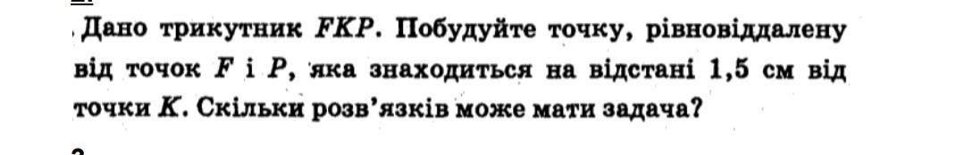 Задача полягає у побудові точки, яка знаходиться на рівновідстані від точок F і P, і на відстані 1,5 см від точки K. Це означає, що шукана точка знаходиться на перетині перпендикуляра, проведеного до середини відрізку FP, і кола радіусом 1,5 см з центром в точці K.