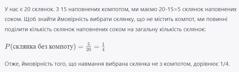 ймовірність того, що навмання вибрана склянка не з компотом, дорівнює 1/4.