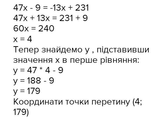 Знайдіть координати точок перетину графіків функцій y = 47x - 9 та y = -13x + 231.