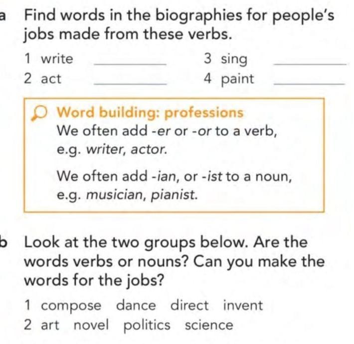 b Look at the two groups below. Are the words verbs or nouns? Can you make the words for the jobs? 1 compose dance direct invent 2 art novel politics science