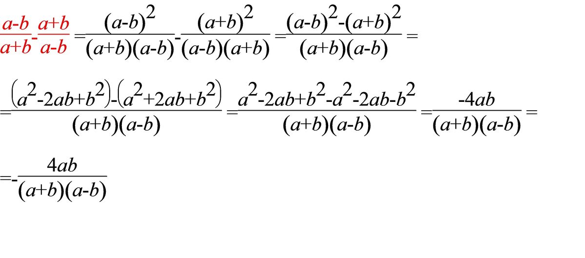 =(((a-b)^2-(a+b)^2)/(a+b)(a-b)=(a^2-2ab+b^2-a^2-2ab-b^2)/(a^2-b^2)=-4ab/(a^2-b^2)
