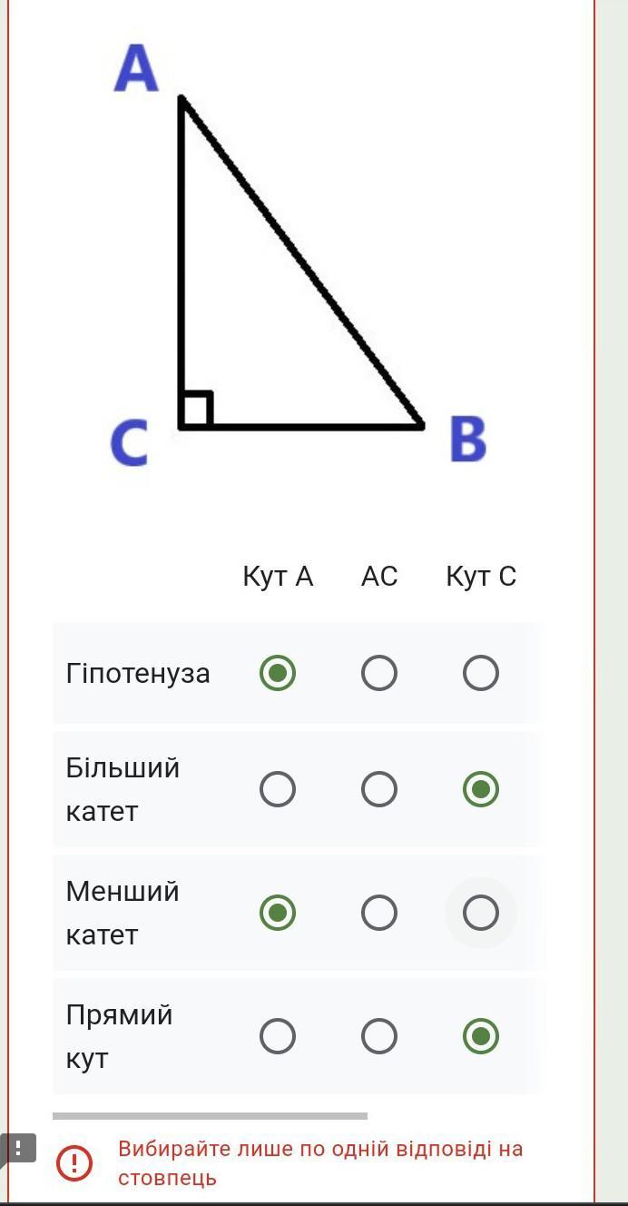 Меньший катет — ВС, из предложенных вариантов подходит угол С