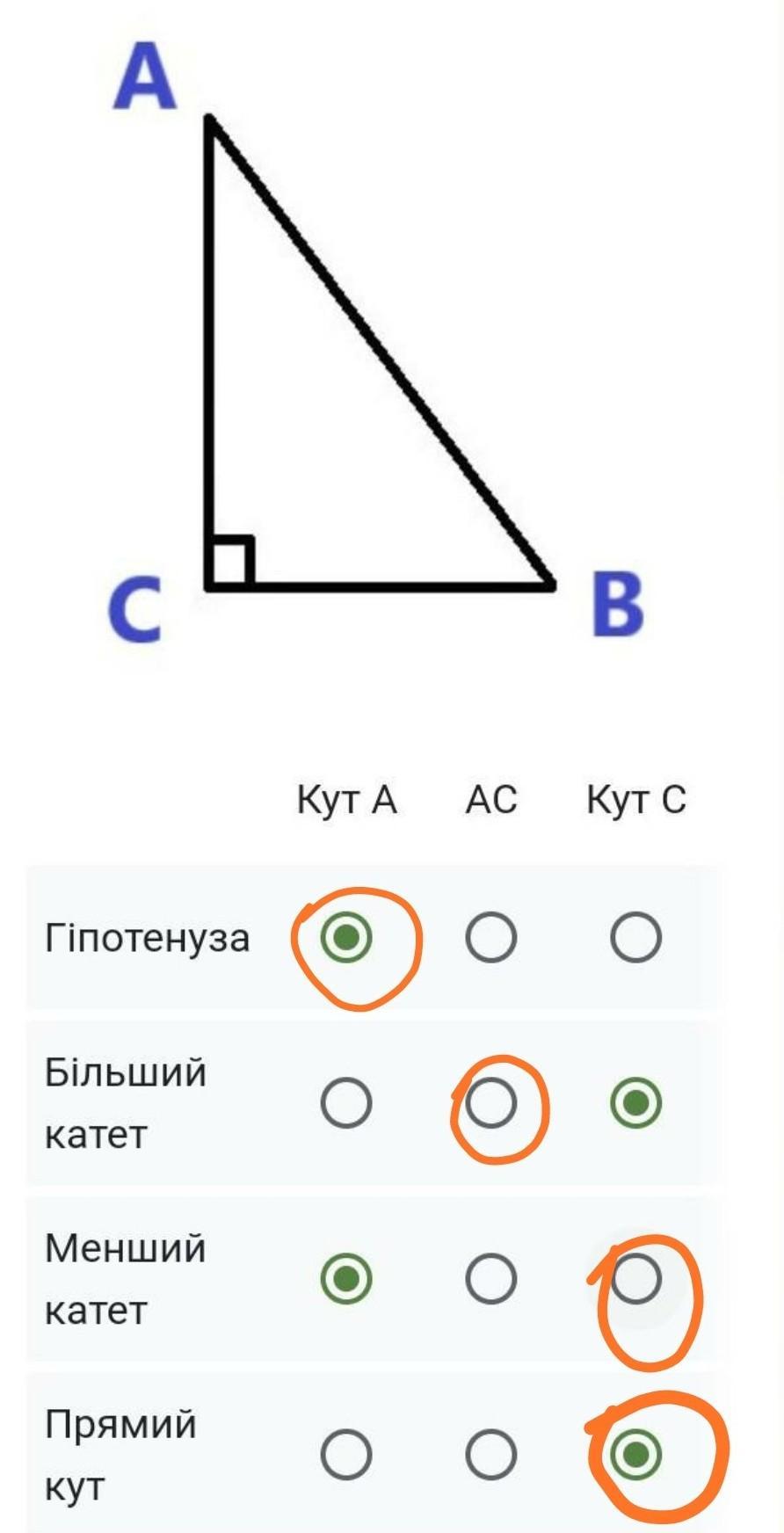 Гипотенуза — АВ, из предложенных вариантов подходит угол А, так как из него образуется и гипотенуза и больший катет