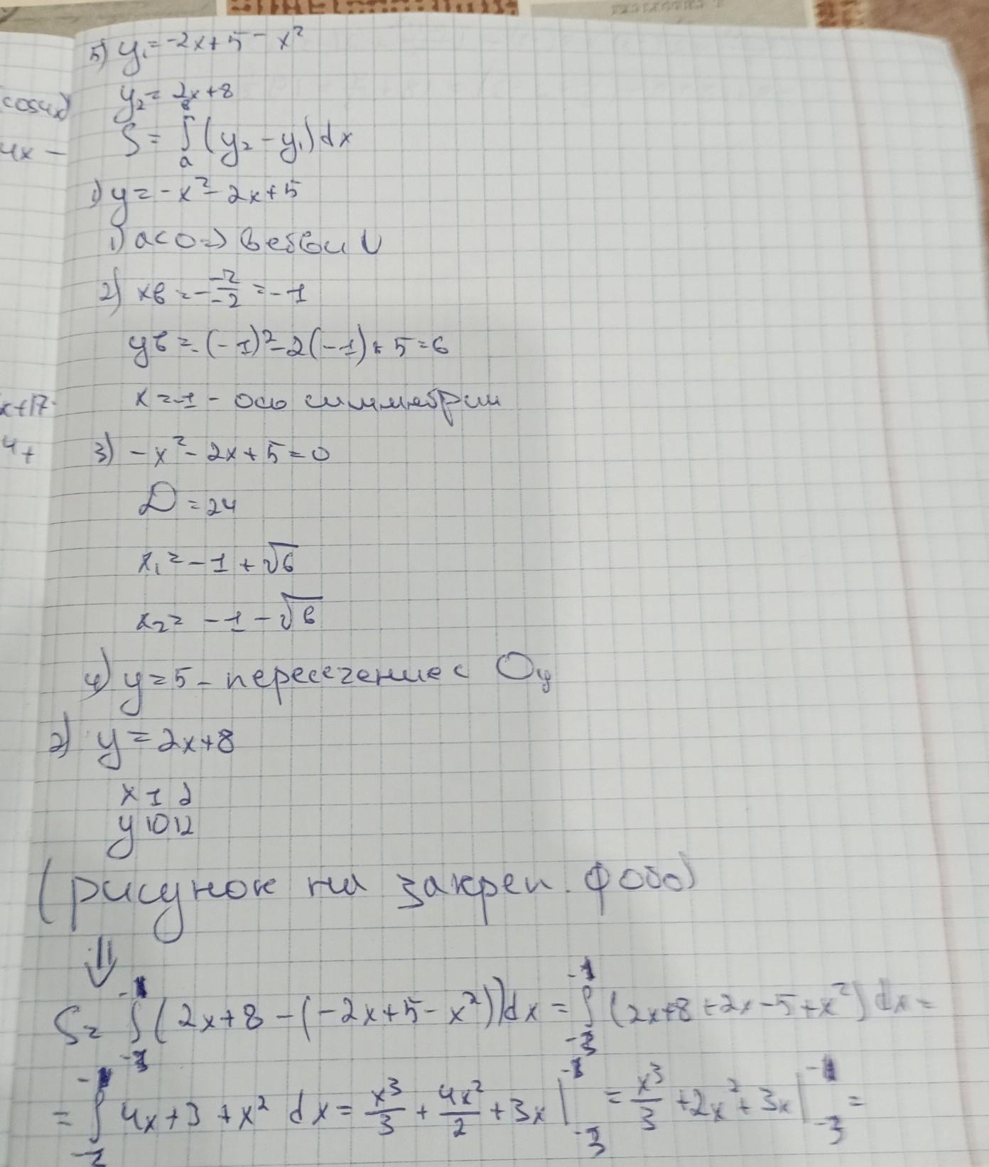 5. Найдите площадь фигуры, ограниченной линиями: у = -2x + 5 - x² и у = 2x +8.