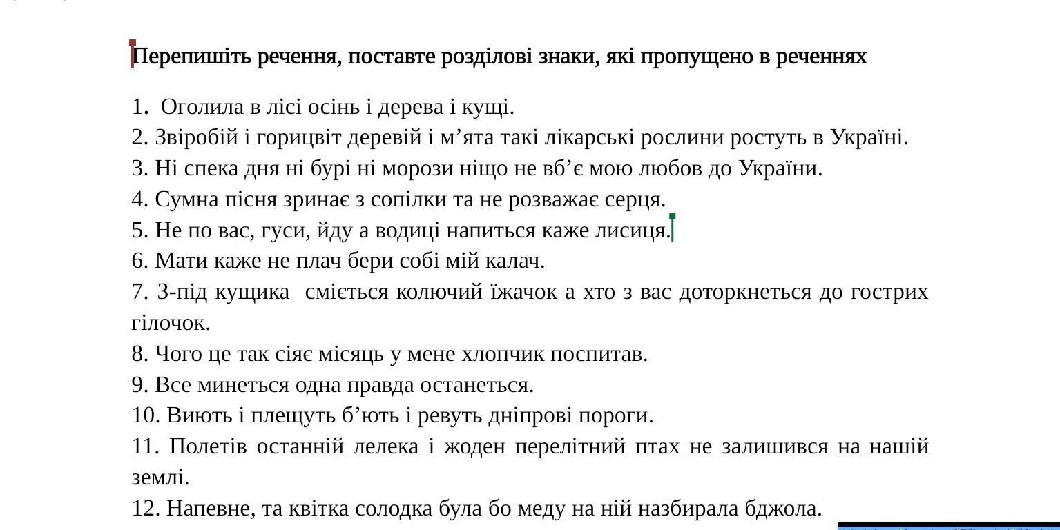 Перепишіть речення, поставте розділові знаки, які пропущено в реченнях 1. Оголила в лісі осінь і дерева і кущі. 2. Звіробій і горицвіт деревій і м’ята такі лікарські рослини ростуть в Україні. 3. Ні спека дня ні бурі ні морози ніщо не вб’є мою любов до України. 4. Сумна пісня зринає з сопілки та не розважає серця. 5. Не по вас, гуси, йду а водиці напиться каже лисиця. 6. Мати каже не плач бери собі мій калач. 7. З-під кущика сміється колючий їжачок а хто з вас доторкнеться до гострих гілочок. 8. Чого так сіяє місяць у мене хлопчик поспитав. 9. Все минеться одна правда останеться. 10. Виють і плещуть б’ють і ревуть дніпрові пороги. 11. Полетів останній лелека і жоден перелітний птах не залишився на нашій землі. 12. Напевне, та квітка солодка була бо меду на ній назбирала бджола.