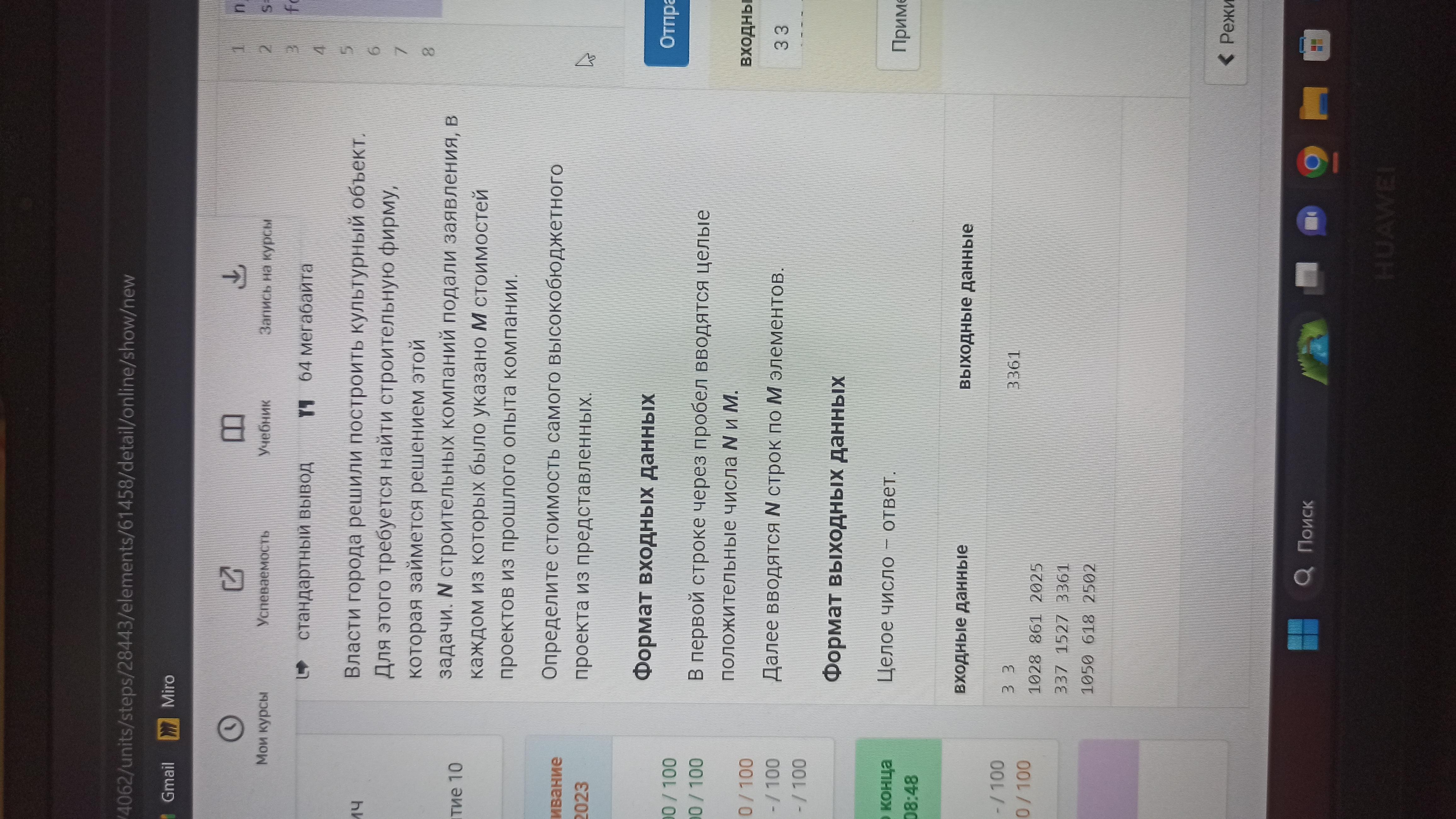 Считываем значения N и M из первой строки входных данных. Затем в цикле считывает N строк по M элементов и находит максимальное значение среди всех элементов. В конце выводит максимальное значение.