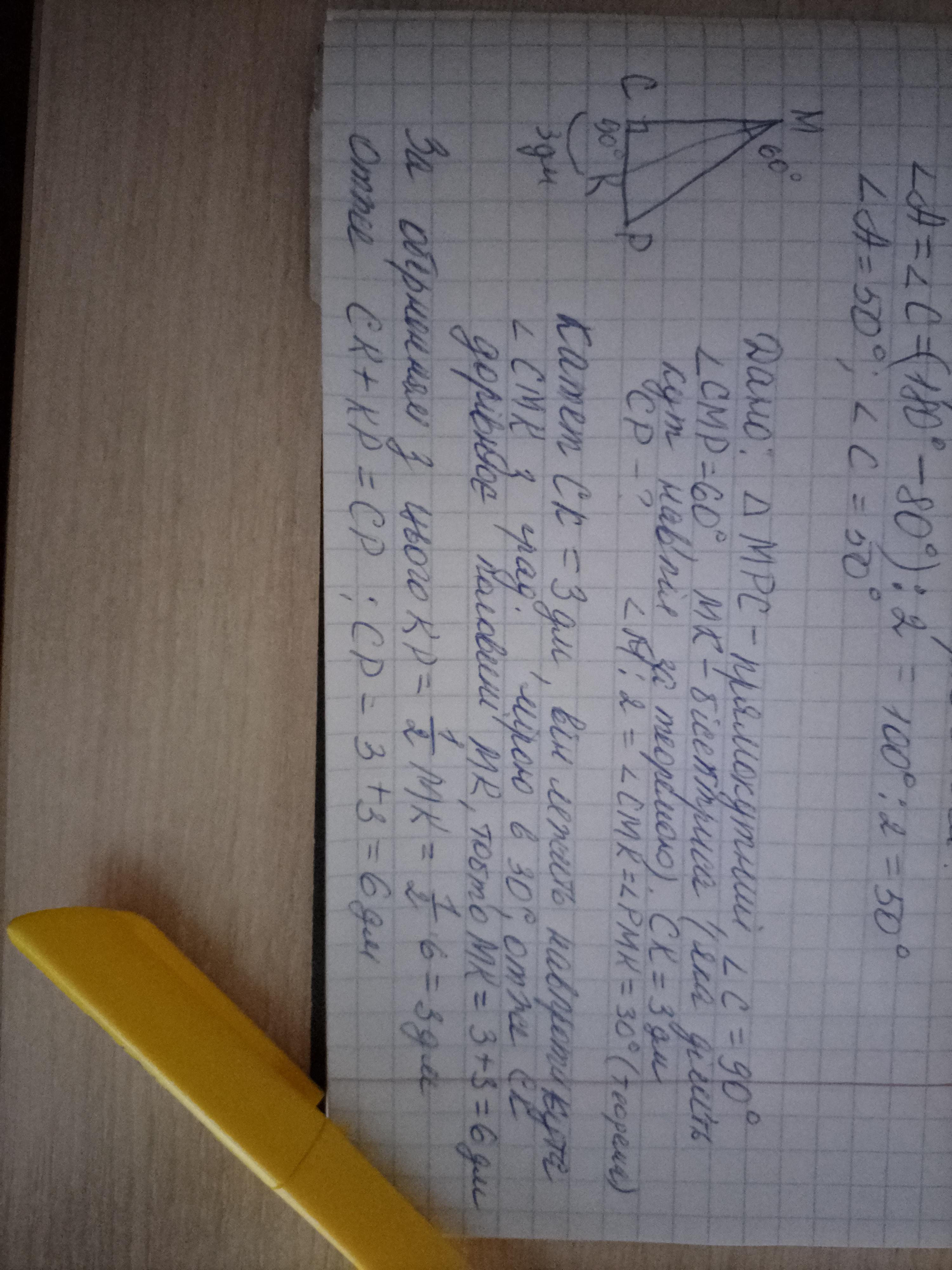 MK- бісектриса прямокутного трикутника MPC, у якого кут C дорівнює 90 градусів, кут CMP дорівнює 60 градусів. Знадіть катет CP цього трикутника, якщо CK дорівнює 3 дм.