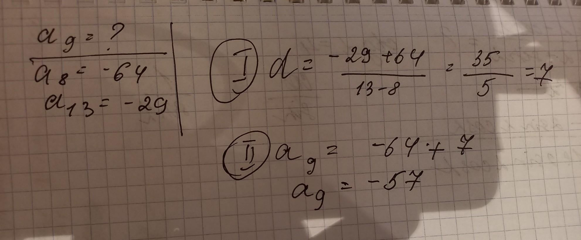 Допоможіть будь ласка.Знайтм дев'ятий член різниці арифметичної прогресії(аn)якщо а8=-64,а13=-29.