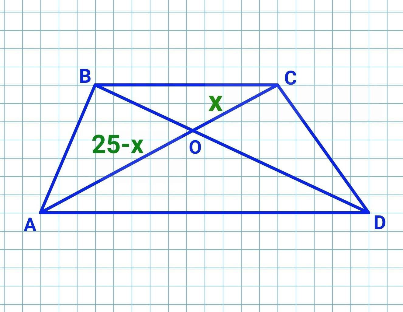 Нехай маємо трапецію ABCD, AD || BC, діагоналі АС і BD перетинаються в точці О. BO:OD=2:3. AC=25см.