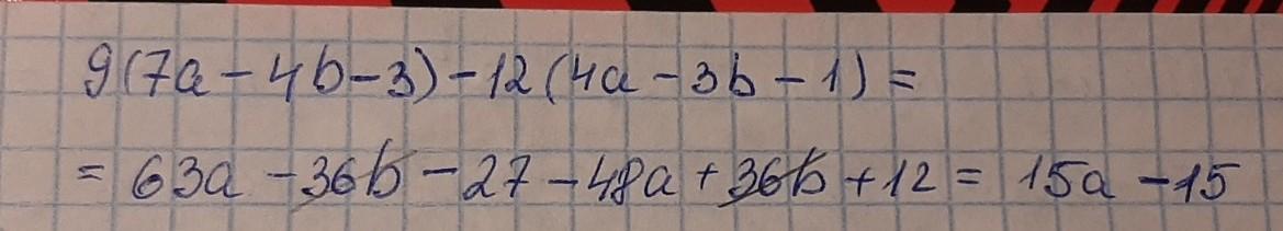 9(7a-4b-3) -12(4a-3b-1) = 63a-36b-27-48a+36b+12 = 15a-15 = 15( a-1)