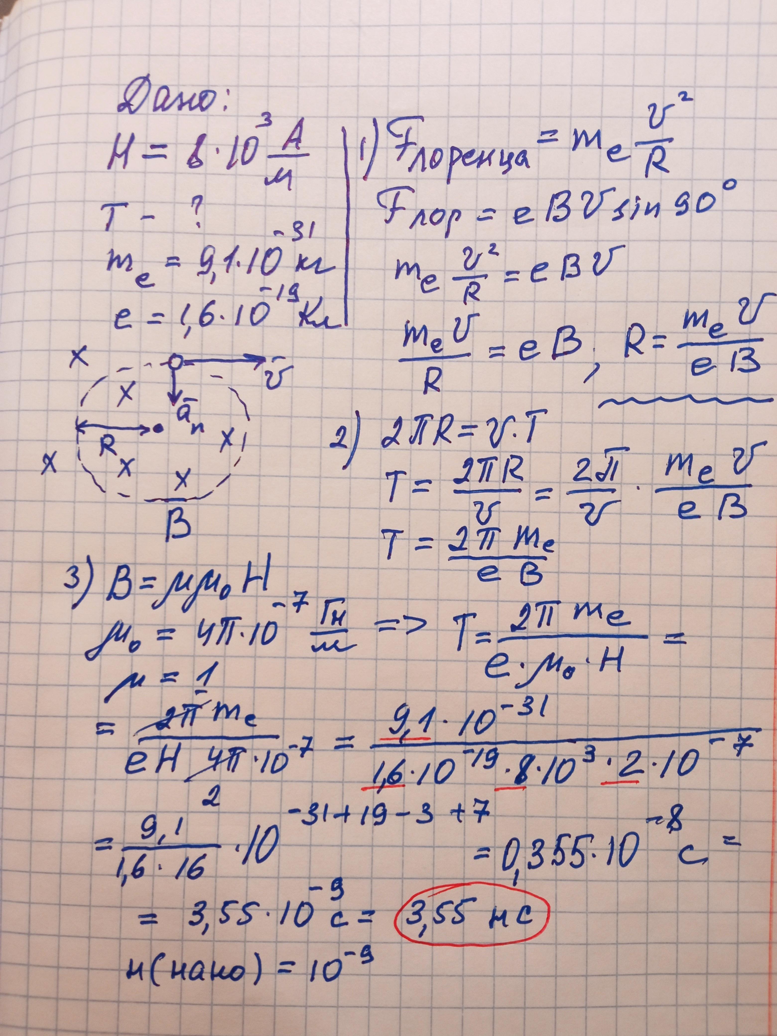 Обчисліть період Т обертання електрона по колу в однорідному магнітному полі напруженістю Н = 8 кА/м
