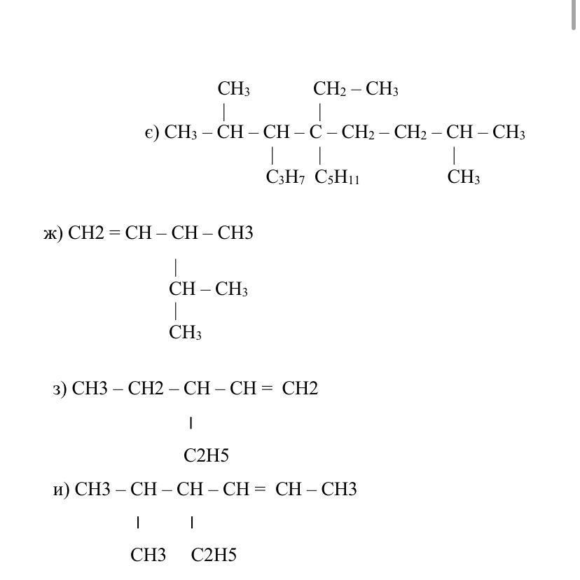 Можешь пожалуйста написать структурные формулы е)3-етил-2,4-дихлорогепт-5-ин; ж)3,4,5-трибромопент-2-ен. г) 1,4 – дихлор – 2 – метил – 4 – бутилдекан