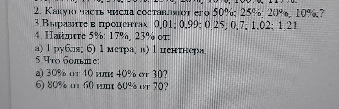 2. Какую часть числа составляют его 50%; 25%; 20%; 10%; 3.Выразите в процентах: 0,01; 0,99: 0,25; 0,7; 1,02; 1,21 4. Найдите 5%; 17%; 23% от: а) 1 рубля; 6) 1 метра; в) 1 центнера 5. Что больш е: 30% от 40 или 40% от 30? 6) 80% от 60 или 60% от 70?
