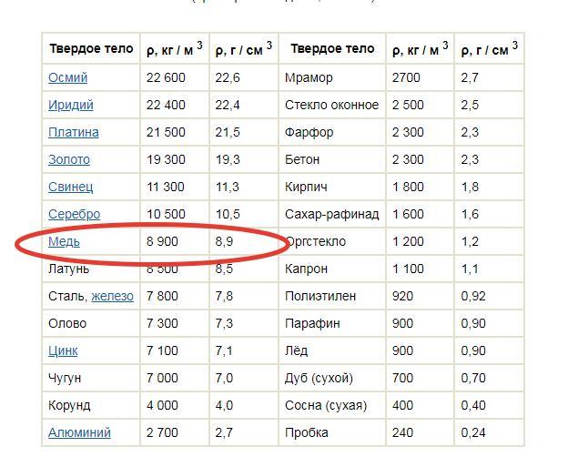 в таблице плотности материалов находим вещество с плотностью ρ=8,9 г/см³ - это медь