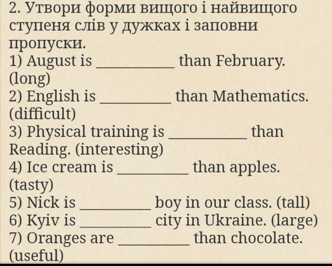 Утвори форми вищого і найвищого ступеня слів у дужках і заповни пропуски.