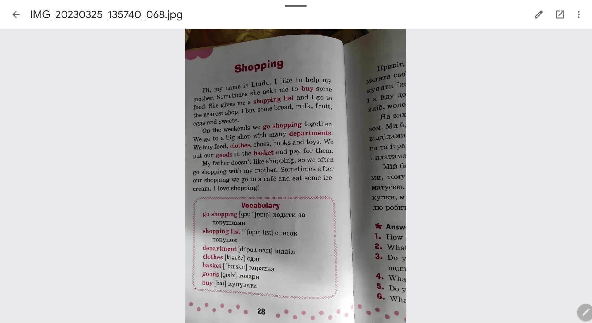 Перевод: Привіт мене звати___. Я люблю допомагати батькам з покупками(шопінгом). І тепер вони попросили мене купити інгрідієнти для супу.