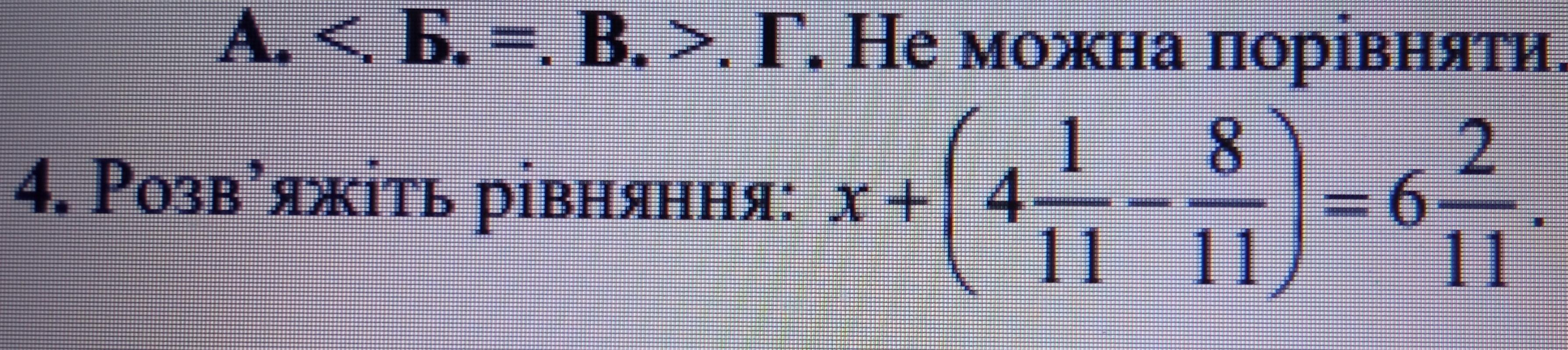 Дивіться, спочатку робимо дію з дужками, для цього нам потрібно перший дріб перевести в неправильний, тобто 4*11+1=45/11. Далі віднімаємо спільний знаменник у них 11, залишається 45-8=37. 6 2/11 також переводимо в неправильний дріб, 6*11+2=68. Далі звичайне рівняння, переносимо через дорівнює і віднімаємо. 68/11-37/11=31/11