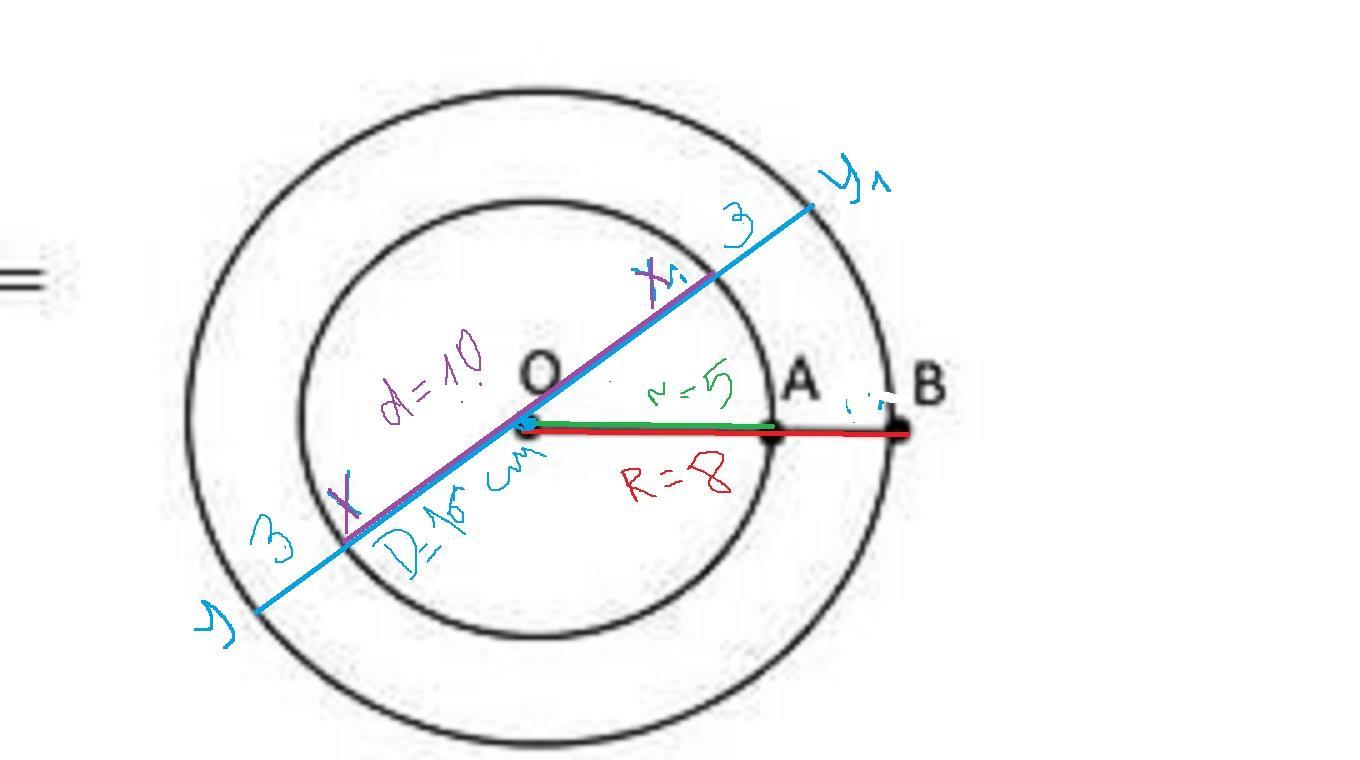 Радіуси концентричних кіл дорівнюють 8 см і 5 см. Знайдіть довжини відрізків, на які діаметр більшого кола ділиться меншим колом. з поясненням будь ласка