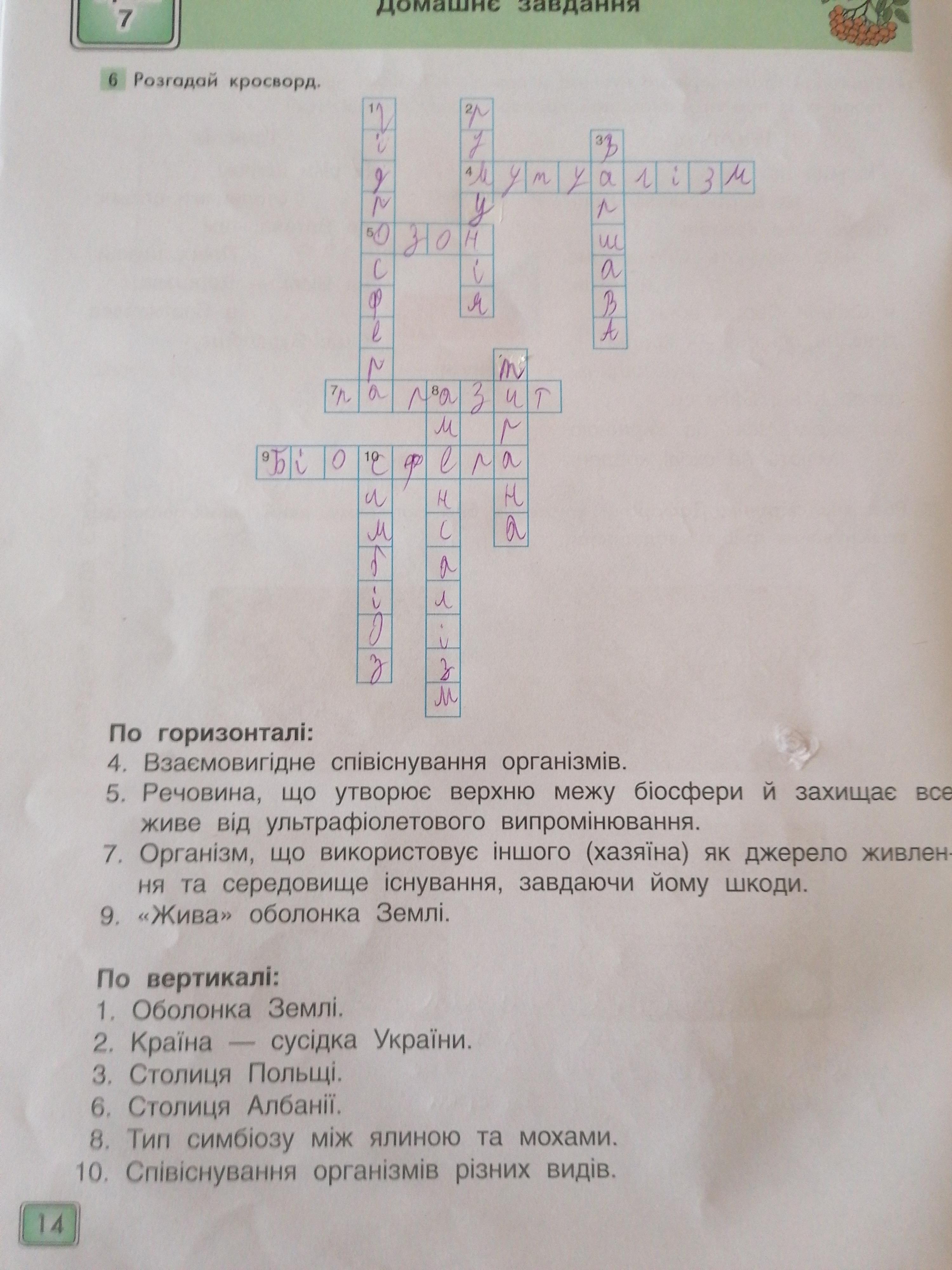 По горизонталі: 4. Взаємовигідне співіснування організмів. 5. Речовина, що утворює верхню межу біосфери й захищае все живе від ультрафіолетового випромінювання. 7. Органiзм, що використовує іншого (хазяїна) як джерело живлен- ня та середовище існування, завдаючи йому шкоди. 9. «Жива» оболонка Землі. По вертикалі: 1. Оболонка Землі. 2. Країна 3. Столиця Польщі. 6. Столиця Албанії. 8. Тип симбіозу мiж ялиною та мохами. 10. Співіснування організмів різних видів. сусідка України.
