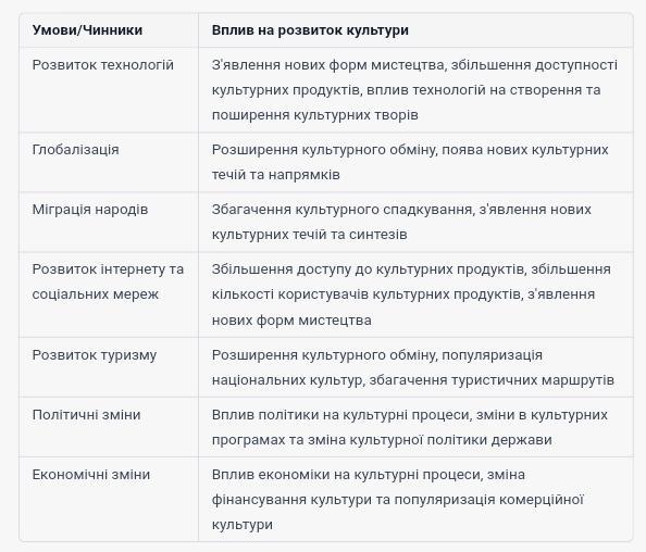 Які умови, чинники впливали на розвиток культури в другій половині XX — на початку XXI ст.? Складіть таблицю.