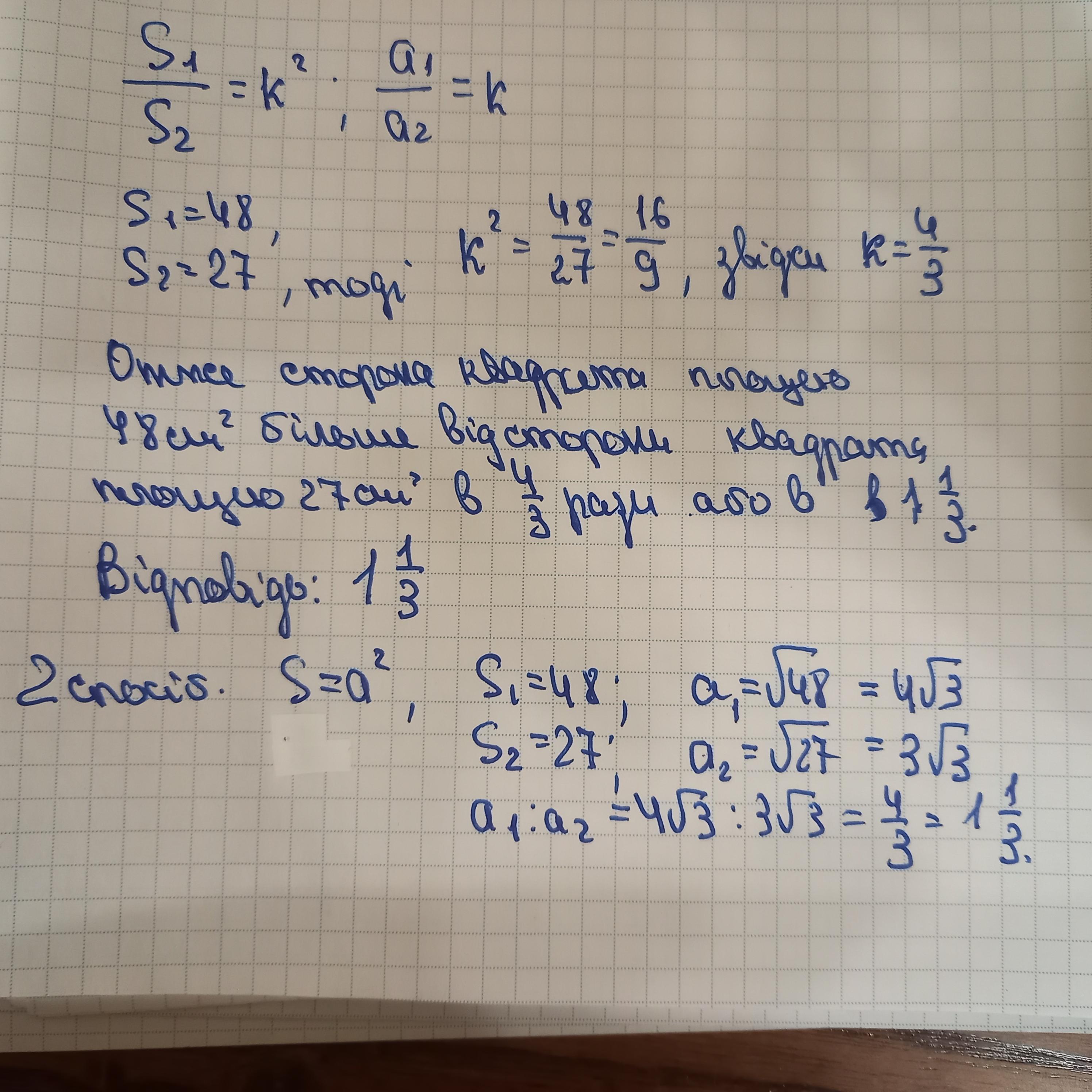 Отже, сторона квадрата площею 48 см² більша від сторони площею 27 см² у: