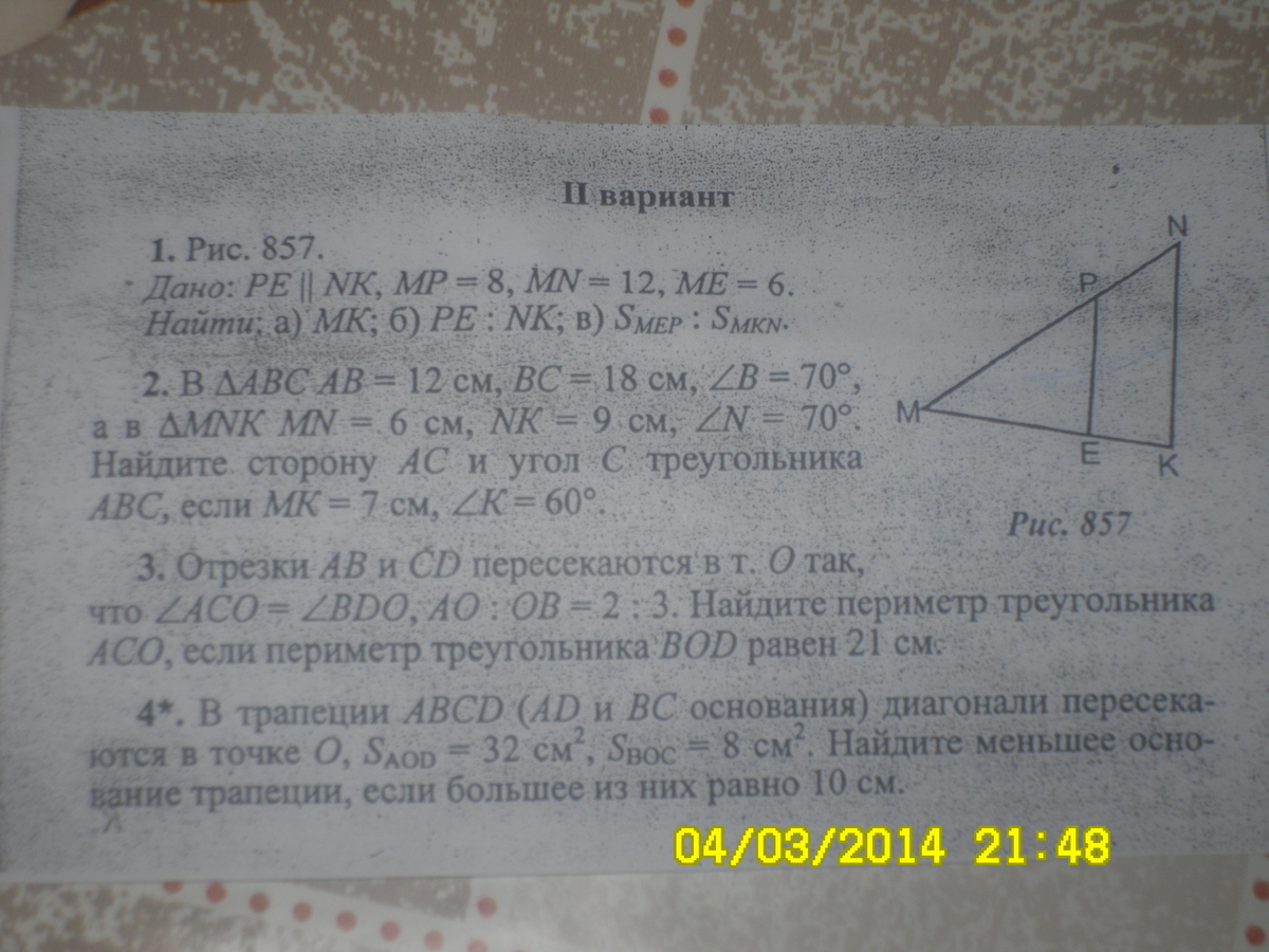 №4 Треугольники AOD и BOC - подобные, так как углы BOC и AOD - равны как вертикальные, BC||AD - по условию задачи и два остальных угла BCO и OAD, CBO и ODA треугольников тоже равны, как лежащие между параллельными сторонами и получаем подобие треугольников за равными тремя углами. Площади подобных треугольников относятся как квадраты их линейных размеров, то естьSAOD/SBOC=(AD)^2/(BC)^232/8=100/(BC)^2(BC)^2=8*100/32=25BC=5