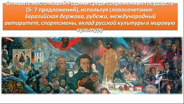 Россия-Евразийская держава,она находится на материке Евразия.Россия-самая большая страна во всём мире,вклад русской культуры в мировую культуру очень велик,поэтому за рубежом наш международный авторитет очень силён.(про спортсменов можно дополнить с интернета).Я очень горжусь и люблю свою родину-Россию