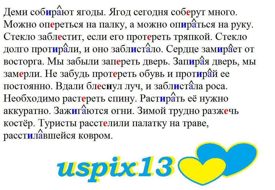 Деми собирают ягоды. Ягод сегодня соберут много. Мож- но оп..реться на палку, а можно оп..раться на руку. Стекло забл..стит, если его прот..реть тряпкой. Стекло долго про- т..рали, и оно забл..стало. Сердце зам..рает от восторга. Мы забыли зап..реть дверь. Зап..рая дверь, мы зам..рли. Не за- будь прот..реть обувь и прот..рай ее постоянно. Вдали бл..с..ул луч, и забл..стала роса. Необходимо раст..реть спи- ну. Раст..рать её нужно аккуратно. Заж..гаются огни. Зи- мой трудно разжечь костёр. Туристы расст..лили палатку на траве, расст..лавшейся ковром.