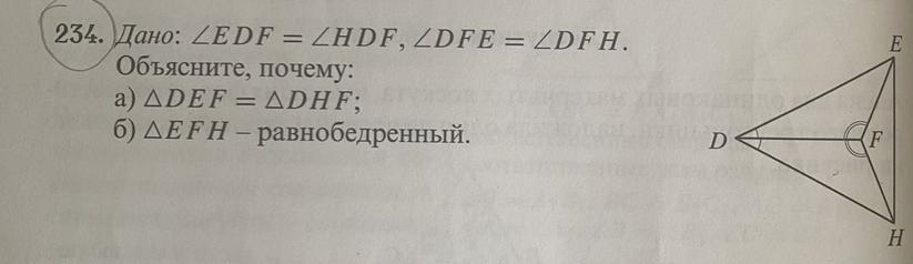 б) Так как ∠DFE=∠DFH (смотри доказательство а) исходя из определения : в равных треугольниках все соотвествующие стороны равны . Значит EF=HF.