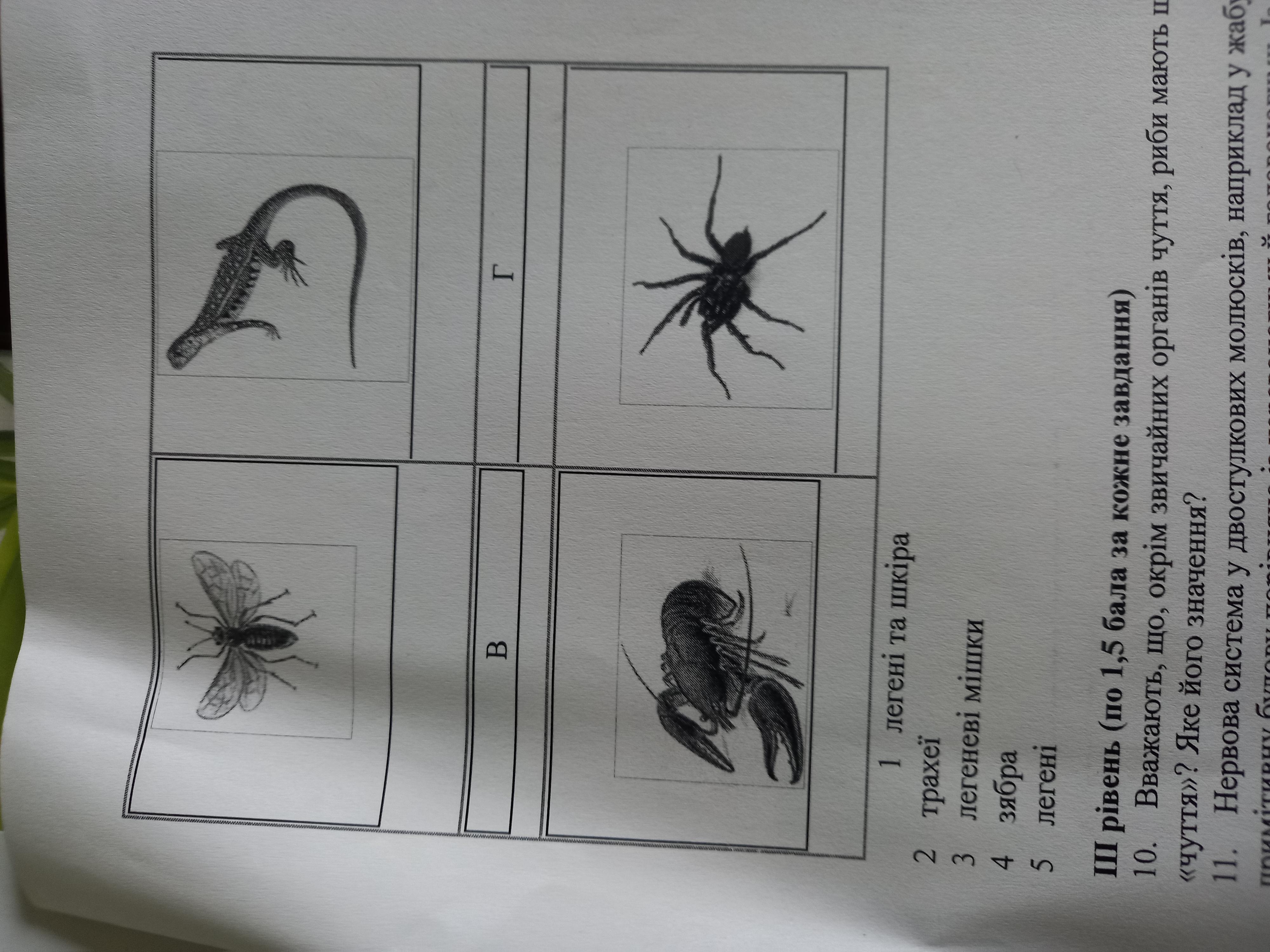 Г) Павук - легеневі мішки і трахеї