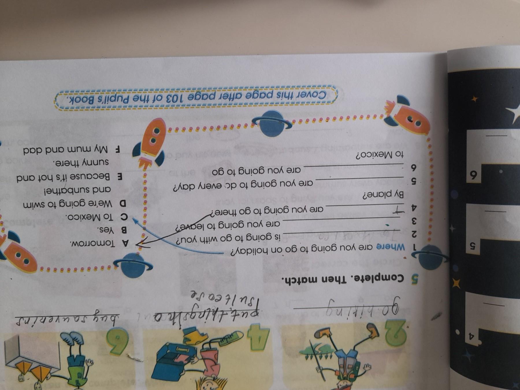 В первые части нам нужно поставить эти 6 помощников : What, How, When, Where, Who. И потом расставить их в нужных местах а потом соединить до больше всего подходящей буквы.