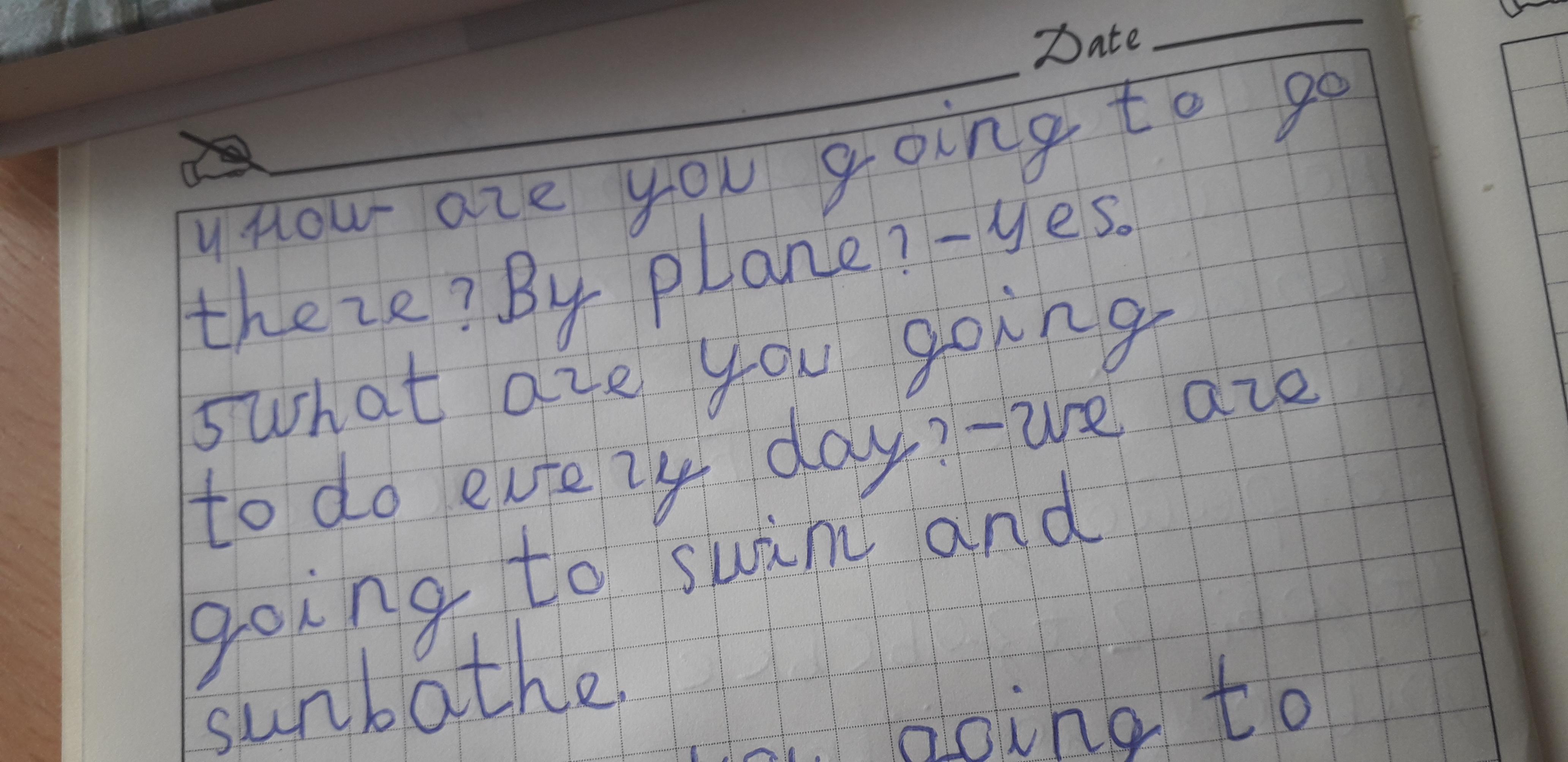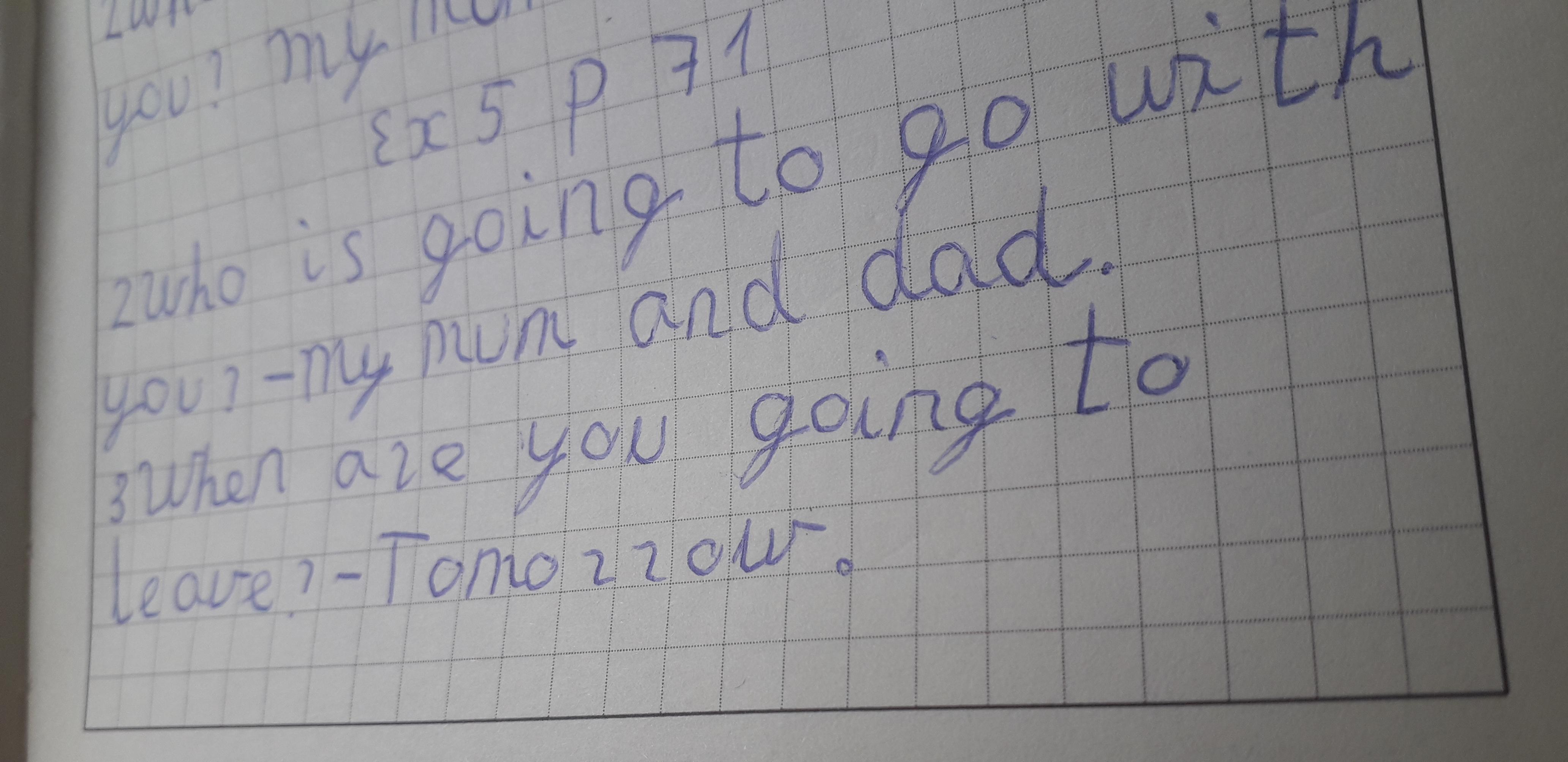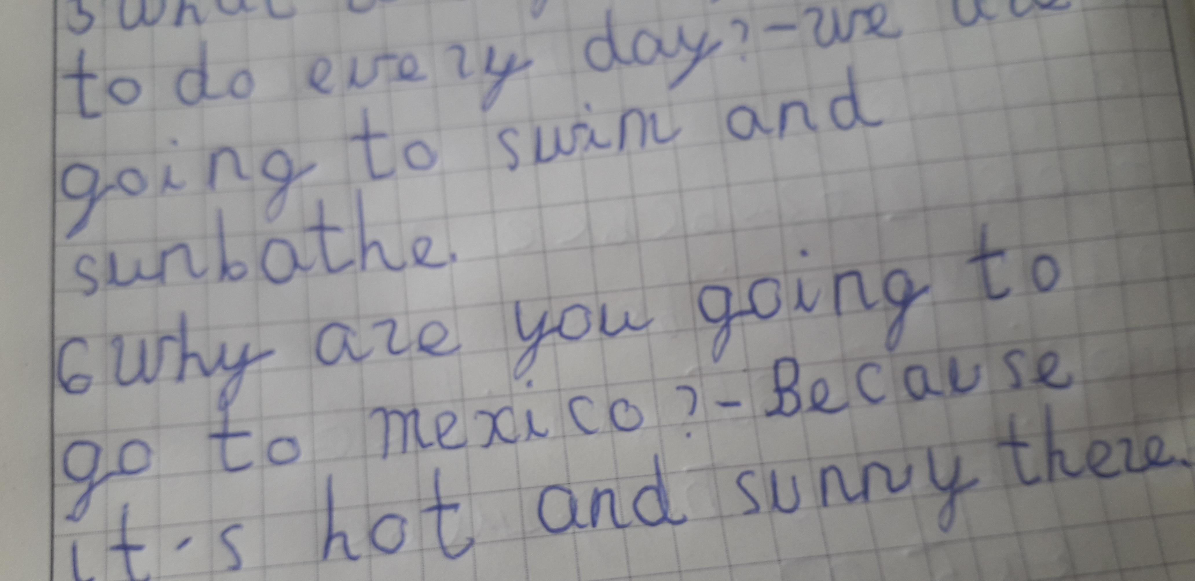 2. Who = My mum and dad 3. When = Tommorow 4. How = Yes 5. What = We're going to swim and sunbathe 6. Why = because it's hot and sunny there