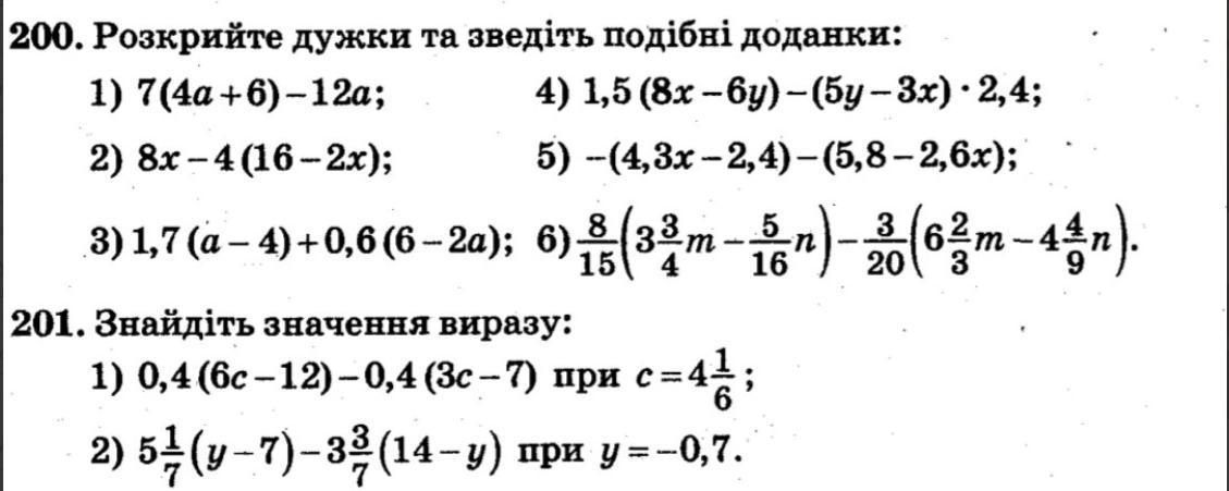 #201. 2)5 1/7(у-7)-3 3/7(14-у) при у=-0,7. 36/7(у-7)-24/7(14-у)=36у/7-36-48+24у/7=(36у+24у)/7-84. (60•0,4)/7-84=24/7-84.
