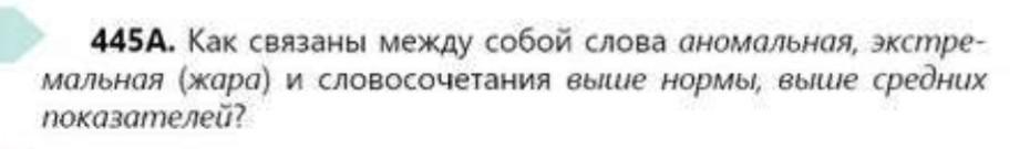 445В. Что обозначают слова норма, апо- гейс, пик, экстремальный уровень? Нари- суйте в тетради термометры, напишите на них цифры, обозначающие температуру. На каких величинах термометра вы напишите слова и словосоче- тания из пункта А? Отметьте цветной ручкой опасный уровень температуры, т.е экстремальную жару.