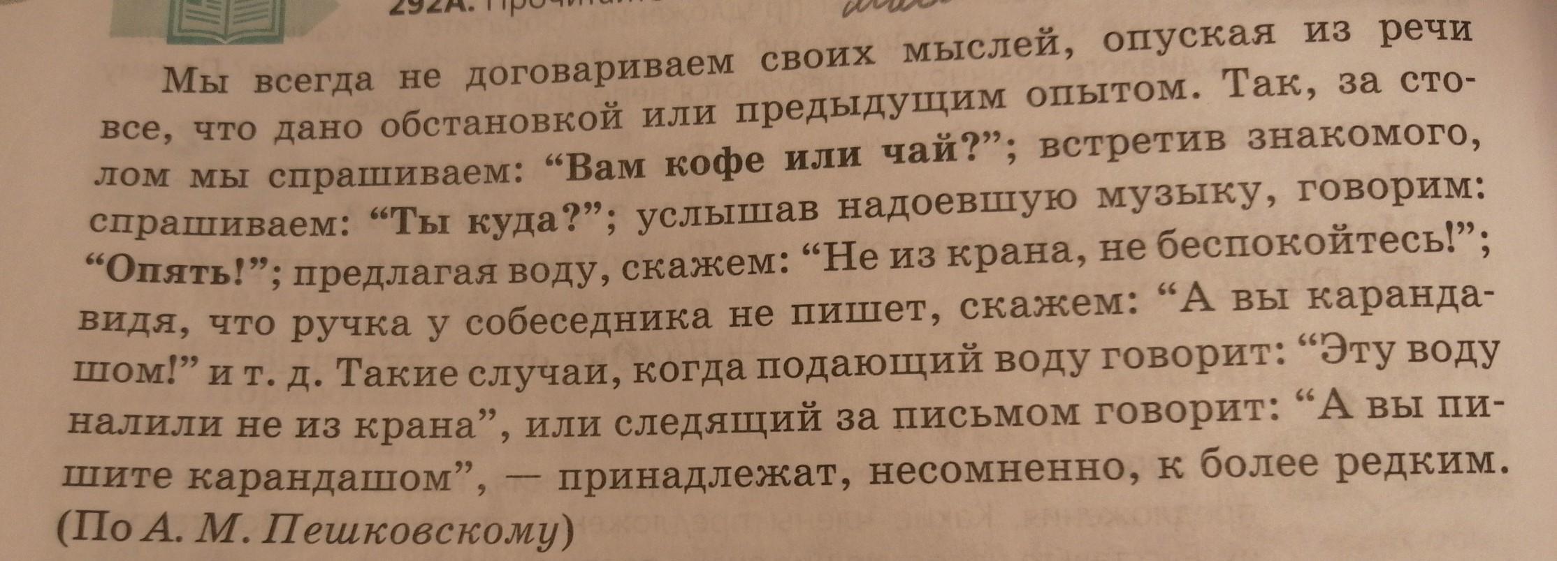 292Б. Определите основную мысль текста и озаглавьте его. О какой особенности разговорной речи пишет А. М. Пешковский? Подтвердите справедливость этой мысли своими наблюдениями над разговорной речью. Почему в разговорной речи мы активно употребляем непол- ные предложения? Почему указанные предложения являются "более редкими"? пожалуйста,помоги с заданием