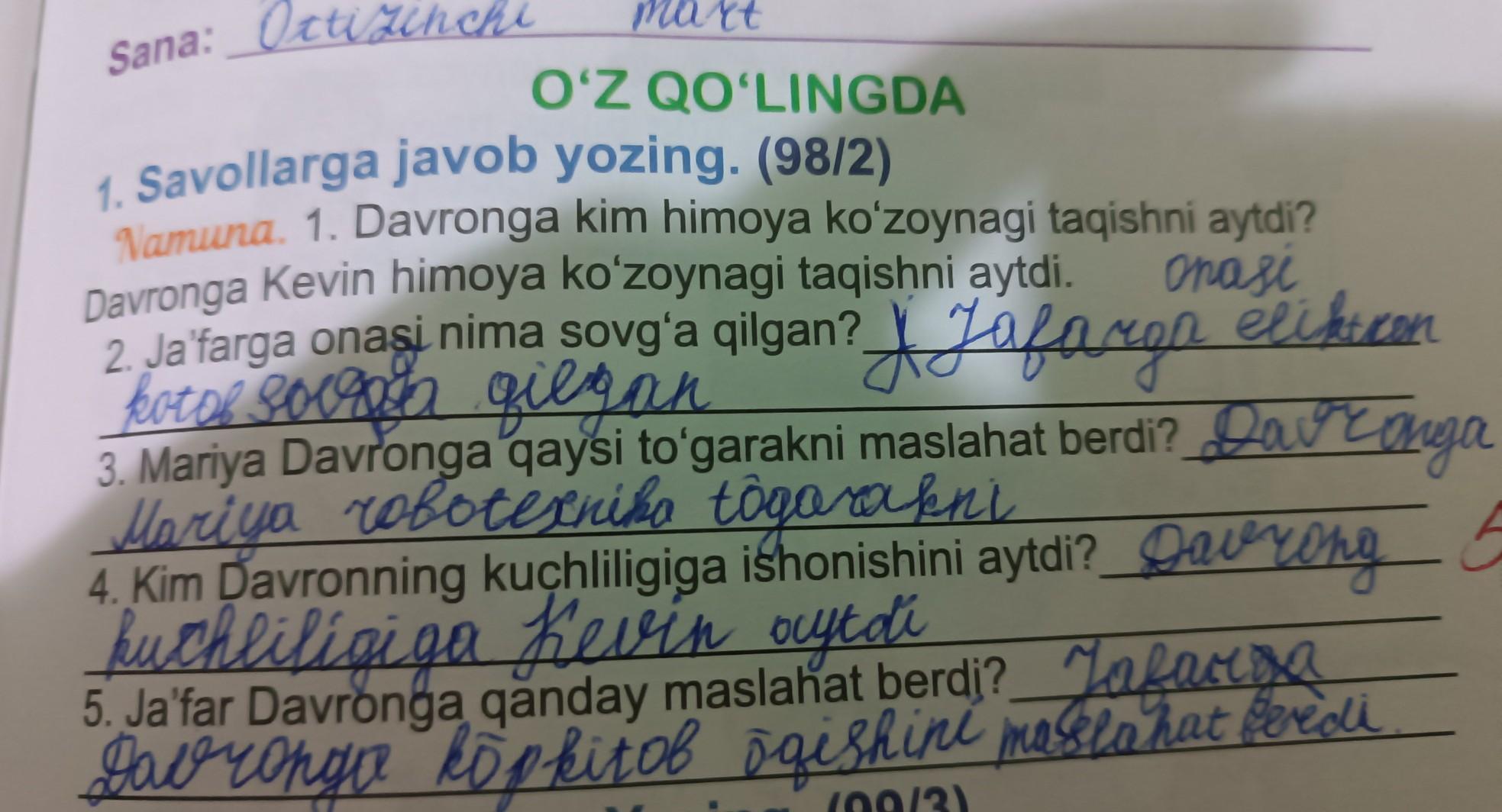 O'Z QO'LINGDA 1. Savollarga javob yozing. (98/2) Namuna. 1. Davronga kim himoya ko'zoynagi taqishni aytdi? Davronga Kevin himoya ko'zoynagi taqishni aytdi. 2. Ja'farga onasi nima sovg'a qilgan? 3. Mariya Davronga qaysi to'garakni maslahat berdi? 4. Kim Davronning kuchliligiga ishonishini aytdi? 5. Ja'far Davronga qanday maslahat berdi?
