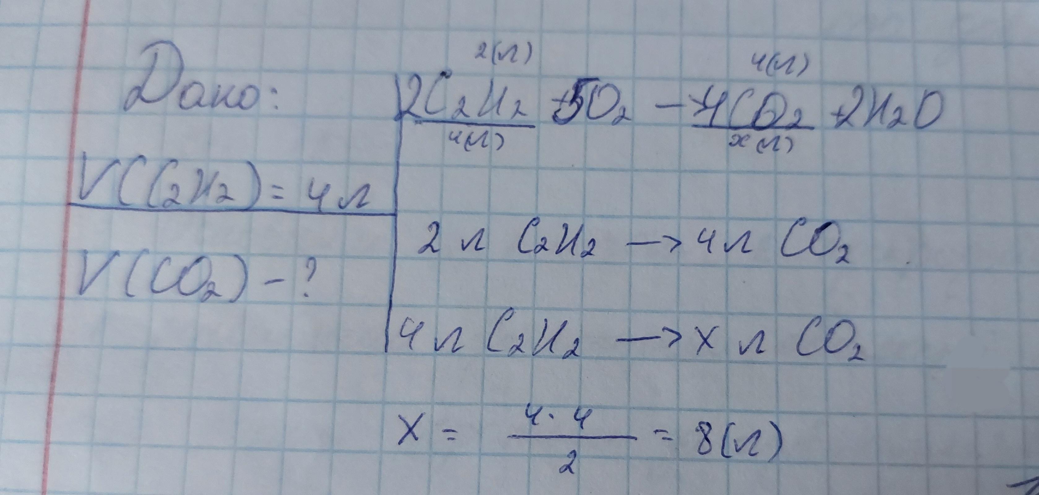 Який об'єм вуглекислого газу (н.у.) утворюється при повному горінні 4л етину С2Н2?