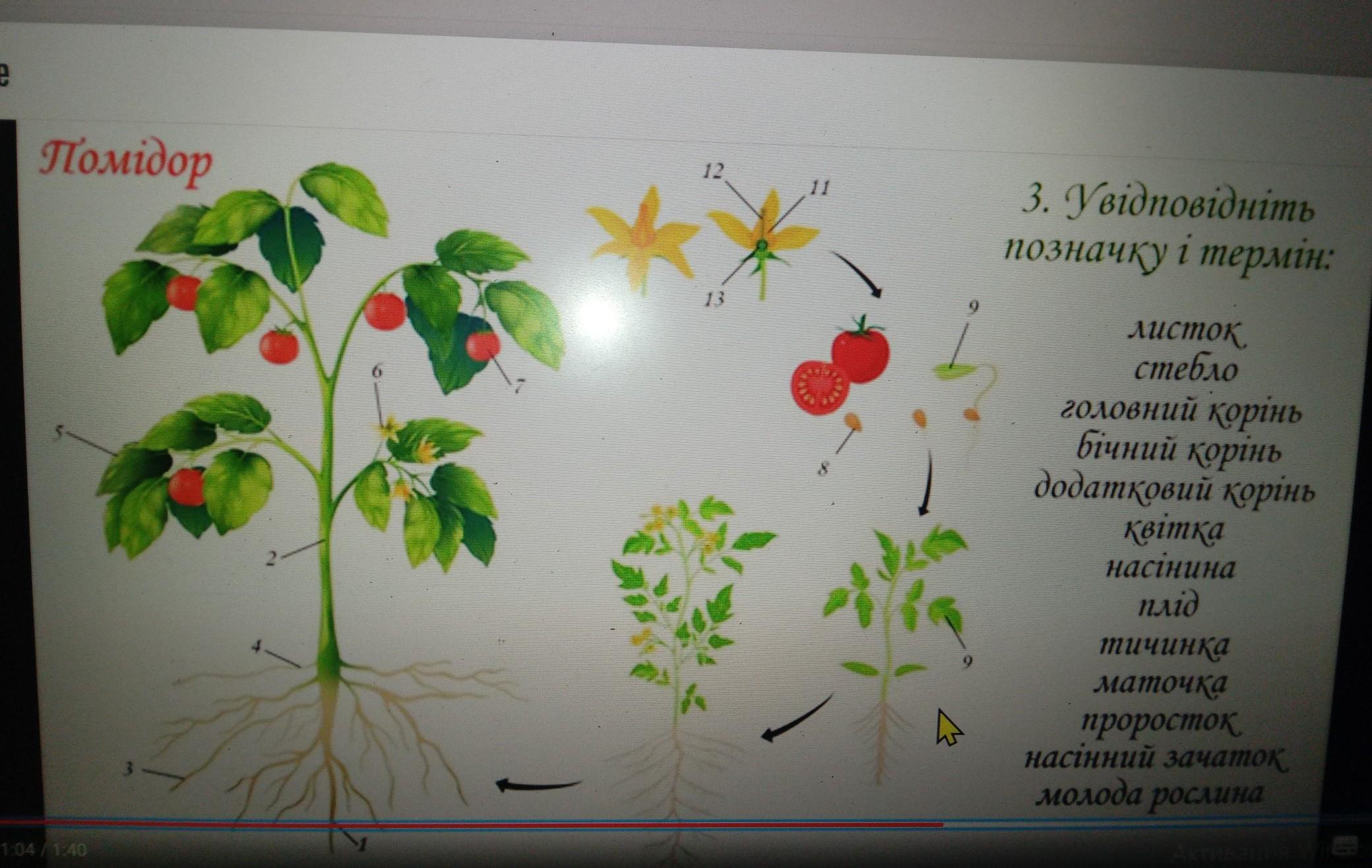 Помідор. Увідповідніть позначку і термін: листок, стебло, головний корінь, бічний корінь, додатковий, корінь, квітка, насінина, плід, тичинка, маточка, проросток, насінний зачаток, молода, рослина.