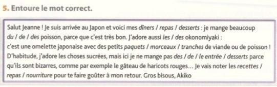 Salut Jeanne ! Je suis arrivée au Japon et voici mes repas : je mange beaucoup de poisson, parce que c'est très bon. J'adore aussi les okonomiyaki : c'est une omelette japonaise avec des petits morceaux de viande ou de poisson ! D'habitude, j'adore les choses sucrées, mais ici je ne mange pas d'entrée ou de dessert parce qu'ils sont bizarres, comme par exemple le gâteau de haricots rouges... Je vais noter les recettes pour te les faire goûter à mon retour. Gros bisous, Akiko.