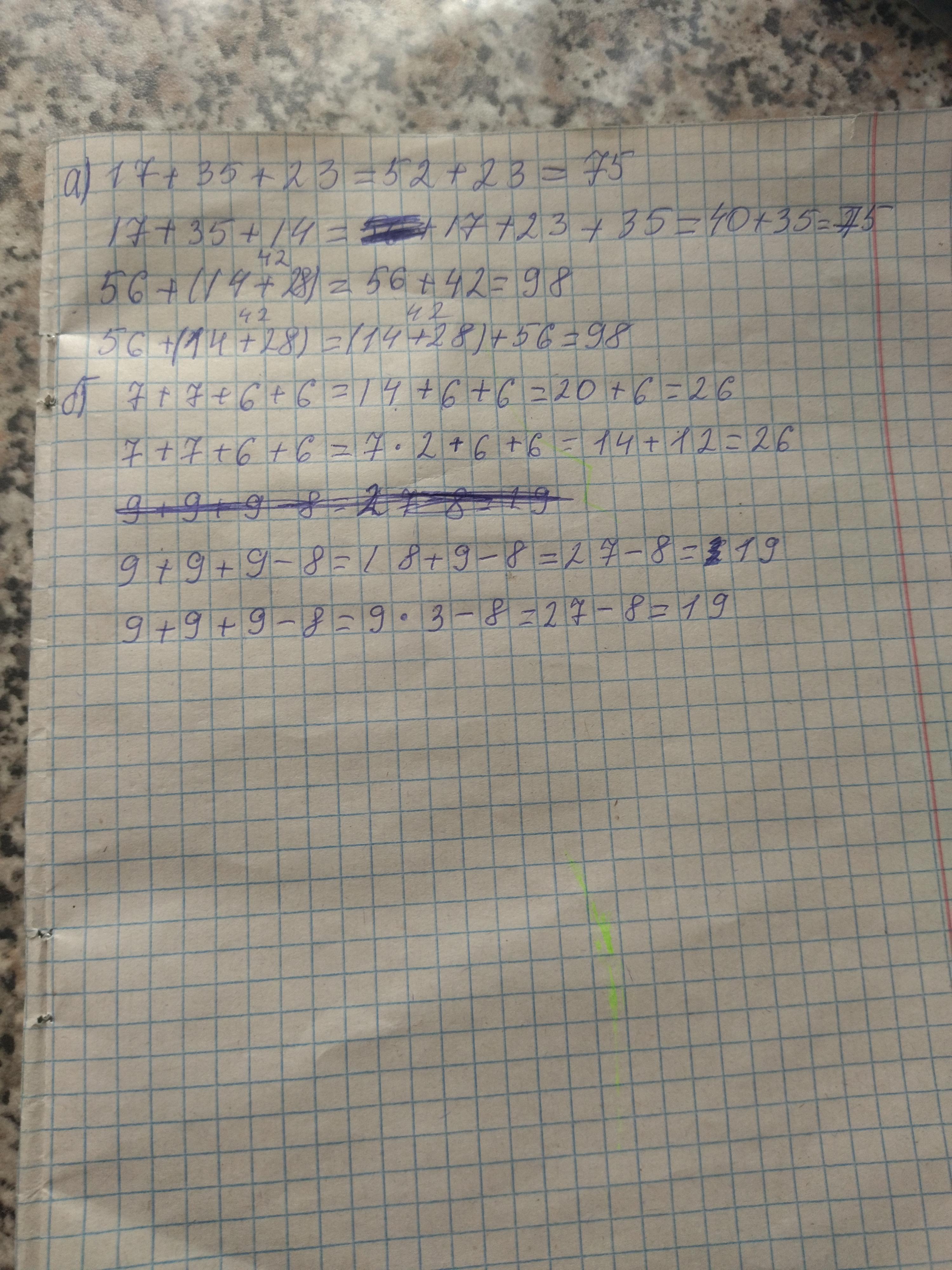 8. а) Выполни вычисления рациональным спо- собом. 17+ 35 +23 б) Упрости выражения. 7+7+6+6 56+ (14+28) 9+9+9-8