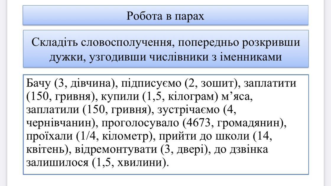 Бачу три дівчини, підписуємо два зошита, заплатити 150 гривень, купили 1, 5 кілограма м'яса, заплатили 150 гривень, зустрічаємо чотирьох чернівчанин, проголосувало 4673 громадян, проїхали 1/ 4 кілометра, прийти до школи чотирнадцятого квітня, відремонтувати троє дверей, до дзвінка залишилось півтори хвилини