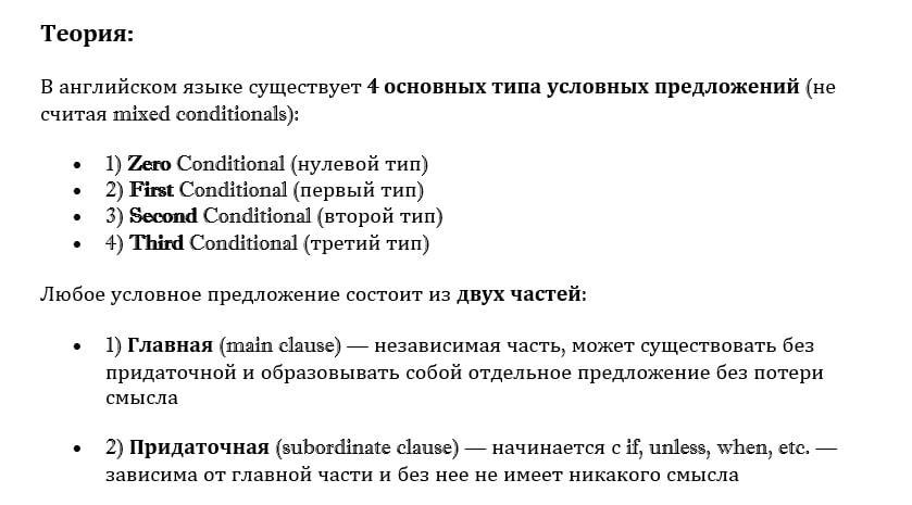 Теория по теме (Conditional sentences — условные предложения) прикреплена во вложениях.