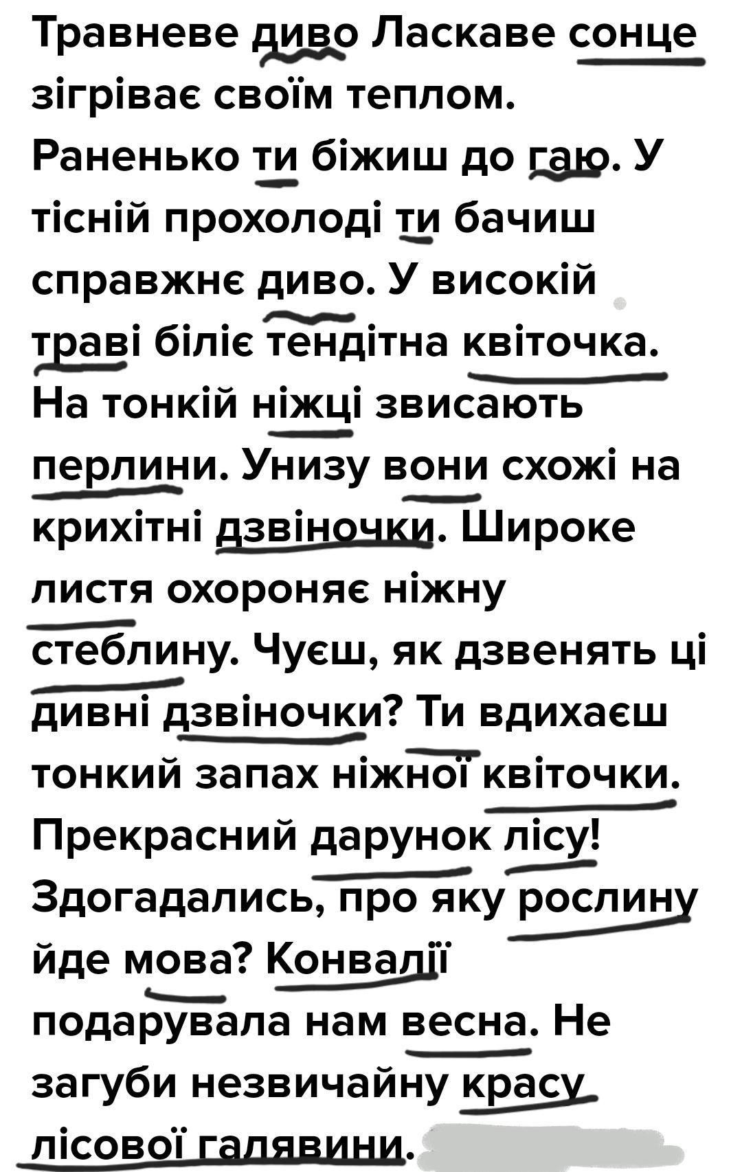 Травневе диво Ласкаве сонце зігріває своїм теплом. Раненько ти біжиш до гаю. У тісній прохолоді ти бачиш справжнє диво. У високій траві біліє тендітна квіточка. На тонкій ніжці звисають перлини. Унизу вони схожі на крихітні дзвіночки. Широке листя охороняє ніжну стеблину. Чуєш, як дзвенять ці дивні дзвіночки? Ти вдихаєш тонкий запах ніжної квіточки. Прекрасний дарунок лісу! Здогадались, про яку рослину йде мова? Конвалії подарувала нам весна. Не загуби незвичайну красу лісової галявини. Завдання: Підкреслити в усіх реченнях головні та другорядні члени речення 2)Виділити корінь у словах : прекрасний, лісової, подарувала .