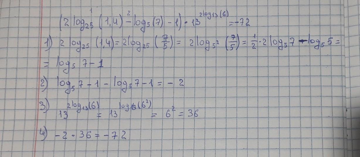 25 можно выразить как 5^2 тем самым по свойству логарифмов выносим его вперед и переворачиваем получается 1/2,затем она сокращаеться с 2 которая стоит перед логарифмом. Мы получили: log5(7)—1