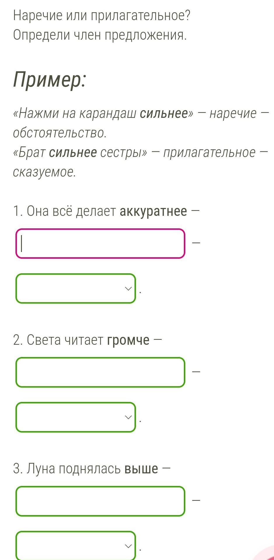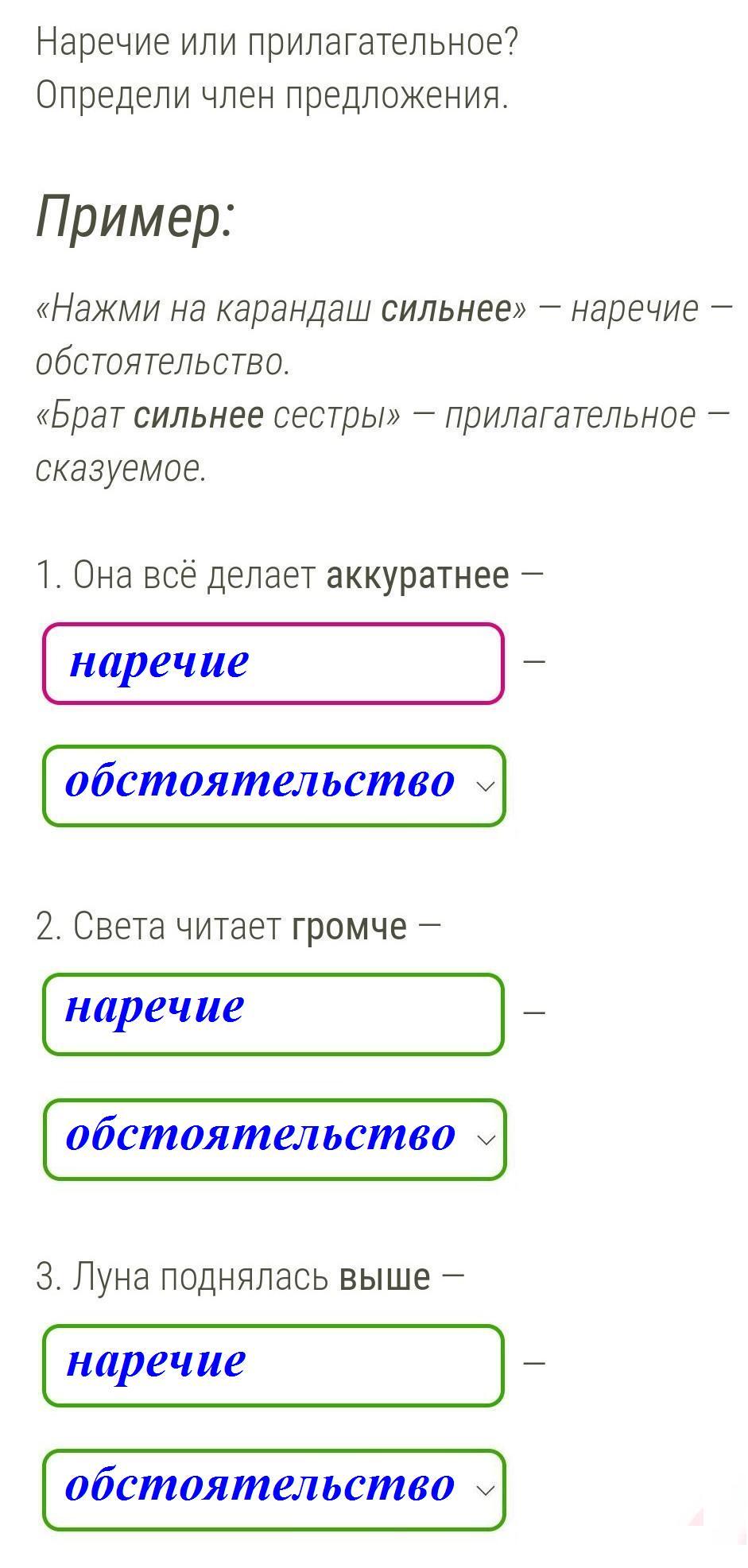Наречие или прилагательное? Определи член предложения. Пример: > - наречие обстоятельство. «Брат сильнее сестры» прилагательное — сказуемое. 1. Она всё делает аккуратнее - 2. Света читает громче - 3. Луна поднялась выше -