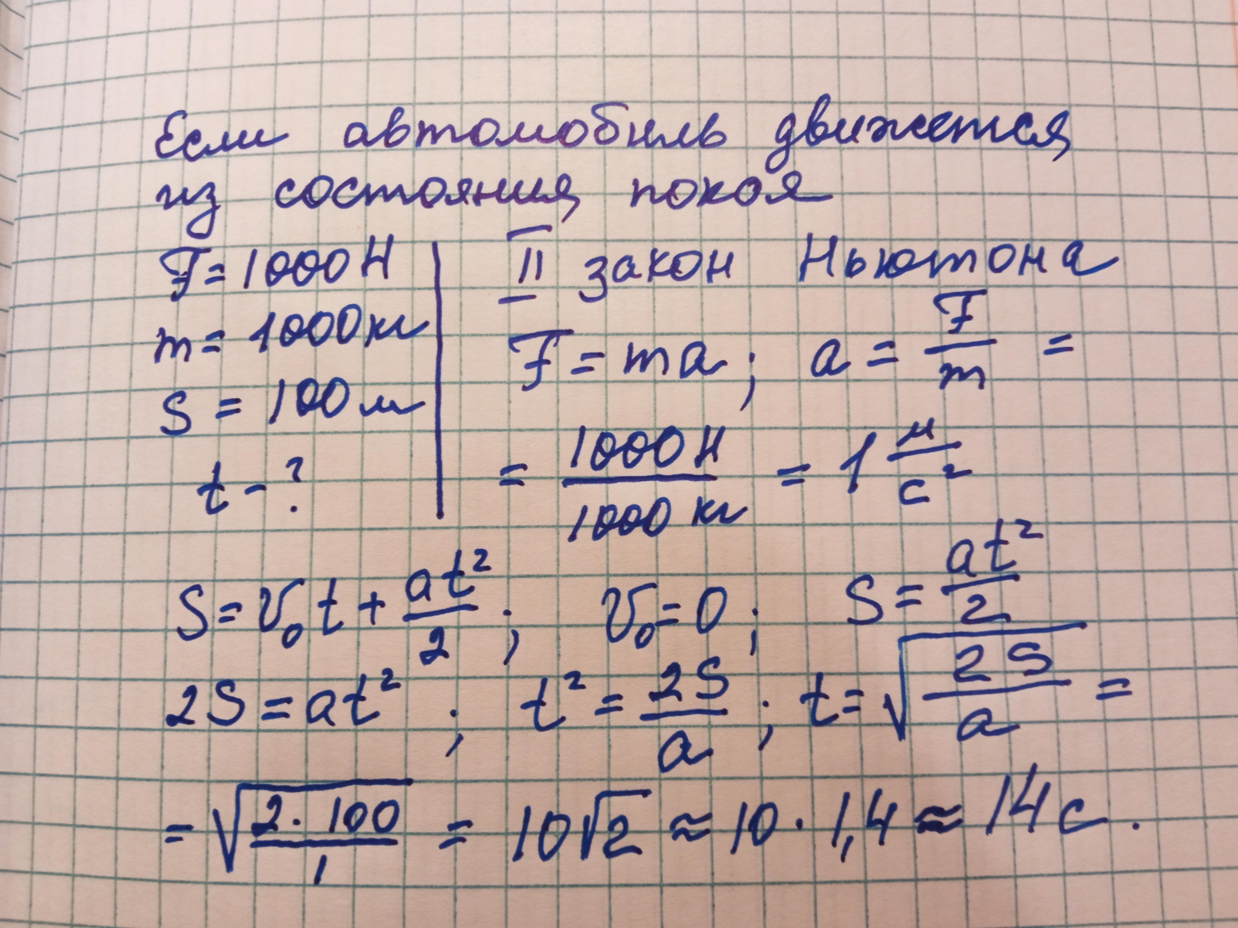За какое время, автомобиль массой 1 т, может преодолеть 100 м, если его двигатель развивает усилие 1000 н ?