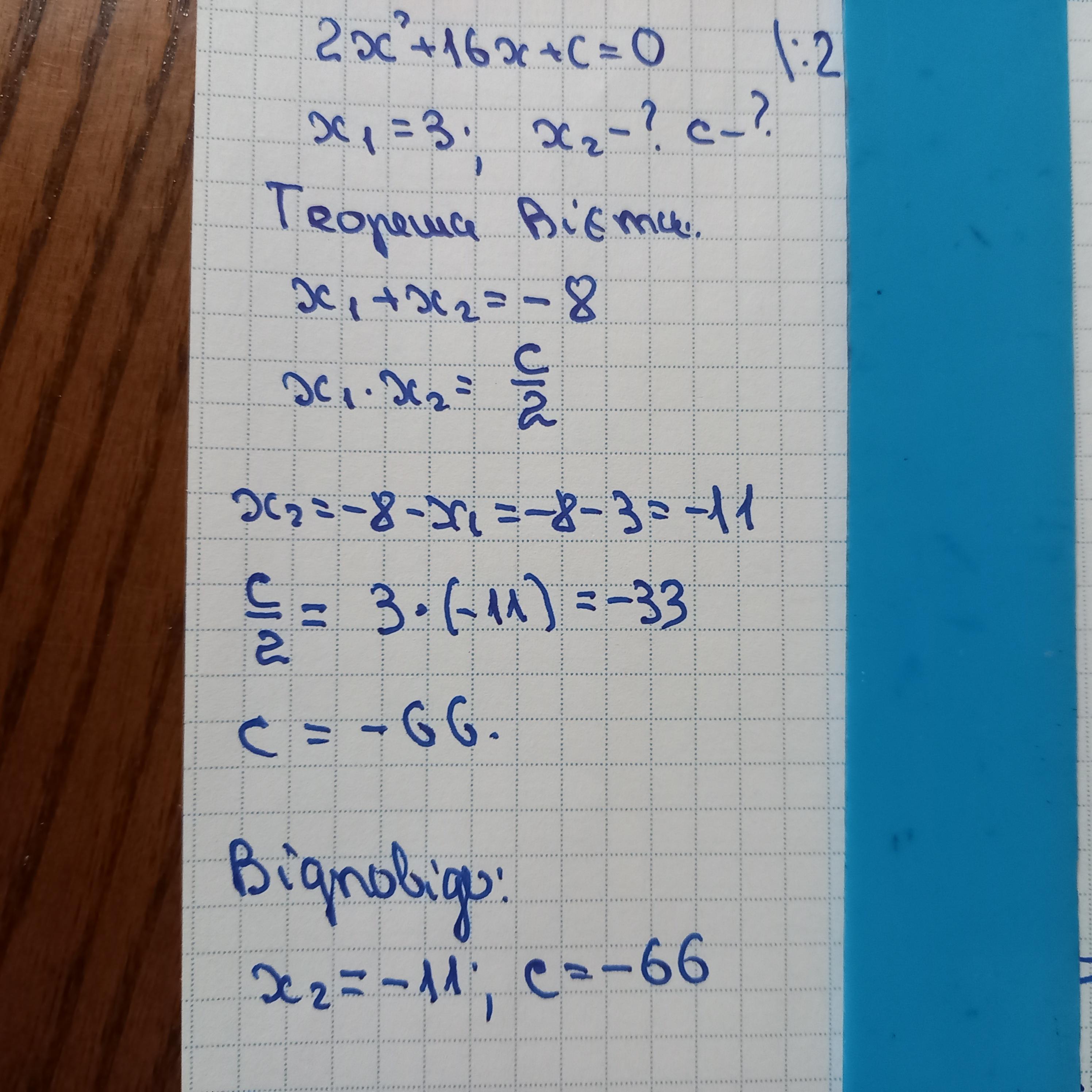 Один з коренів квадратного рівняння 2х²+16х+с=0 дорівнює 3. Знайдіть другий корінь і число с